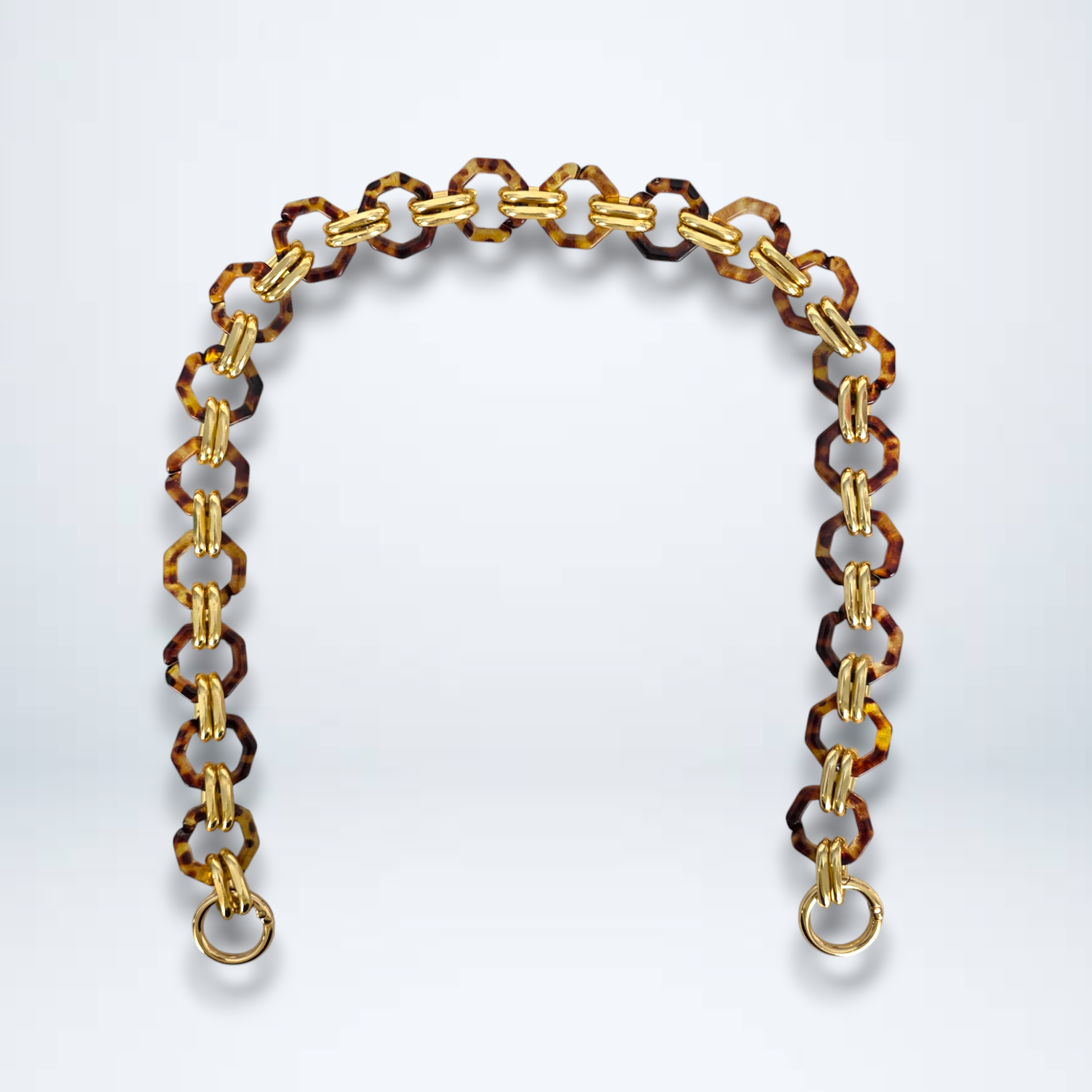 The Acrylic Octagon Handle is a statement accessory crafted from faceted acrylic octagon links, bringing a geometric and contemporary touch to your handmade bags. Its glossy marbled finish — available in Black Marble or classic Tortoiseshell — adds depth, texture, and elegance to any design. Each link is connected with double gold-tone rings, ensuring durability with a luxurious shine.