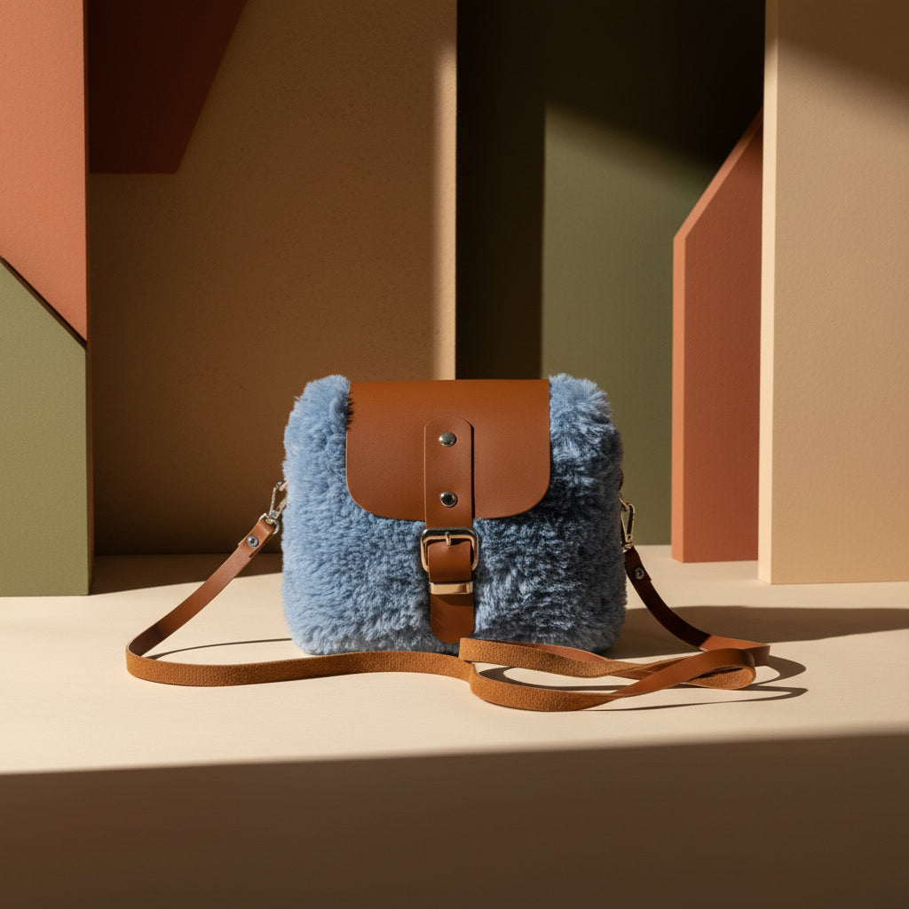 A compact statement piece defined by its voluminous texture and structural leather contrast.